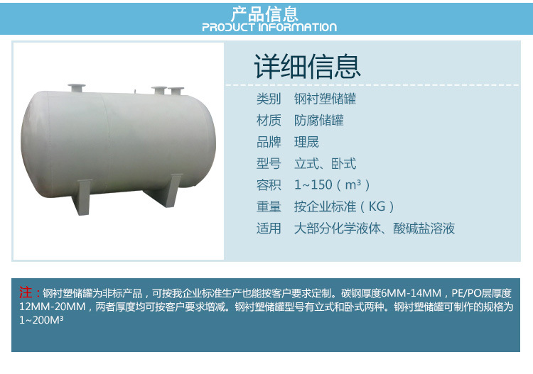 12、全塑PE储罐或钢衬塑PE/PO储罐可盛装的化学品非常广泛,可用于无机酸、有机酸、无机碱、有机碱和有机化合物。但不宜盛装浓硫酸、浓硝酸等强氧化剂,能使PE溶胀的芳烃、卤代芳烃等溶剂。